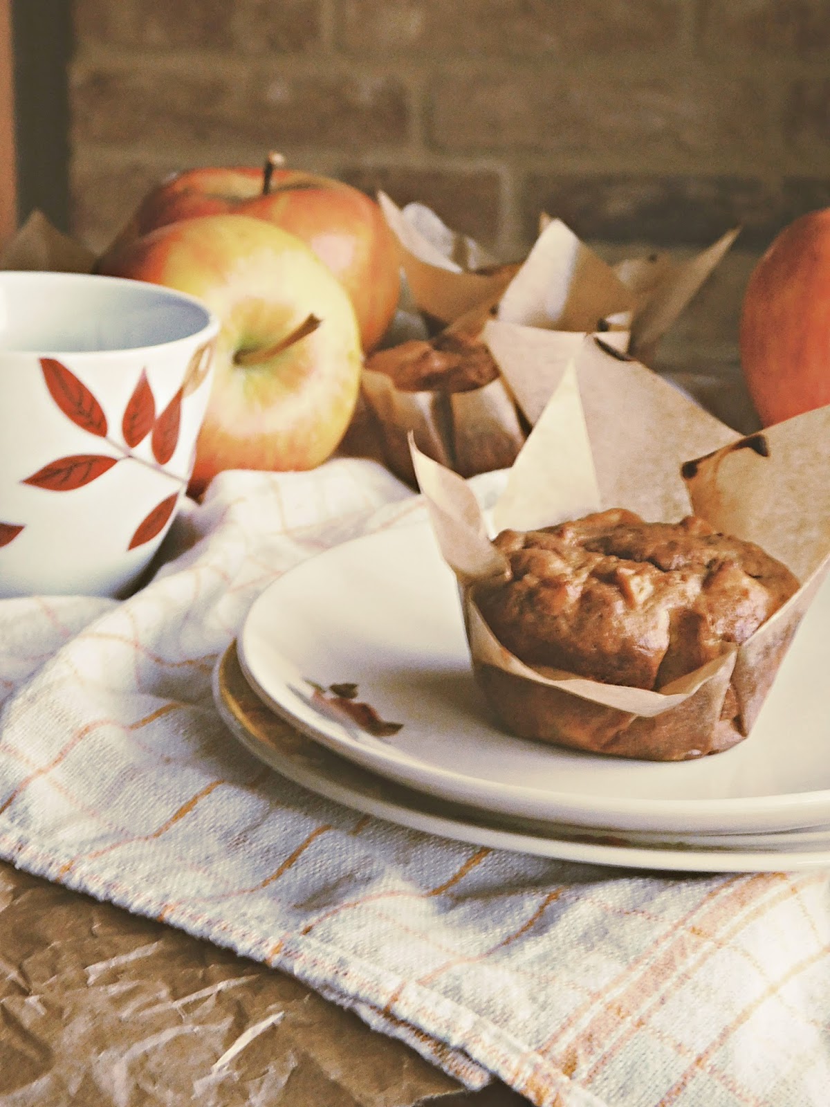 ... muffinki z jabłkiem i cynamonem (o tak, baaardzo pachną cynamonem!). I jeszcze z małą niespodzianką ukrytą w środku - cukierkiem toffi! ;)
