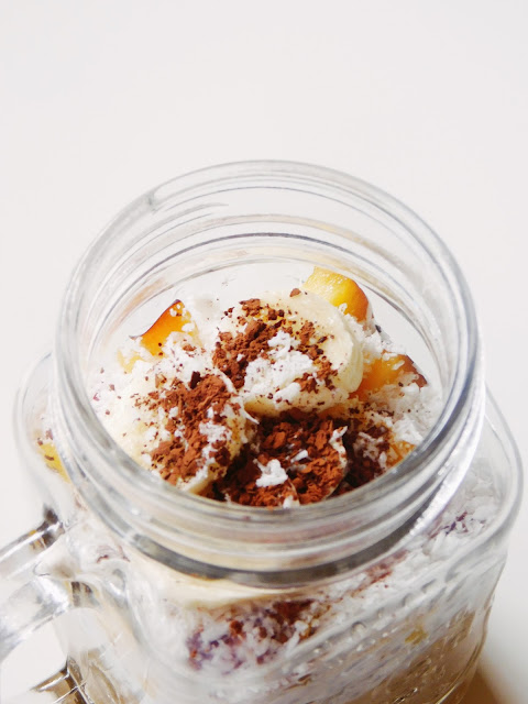 Na dno ulubionego słoiczka/ulubionej miseczki przelewamy bananowy mus, a następnie jogurt z chia. Na koniec dekorujemy ulubionymi owocami, wiórkami kokosowymi itd. Co tylko dusza zapragnie. :D