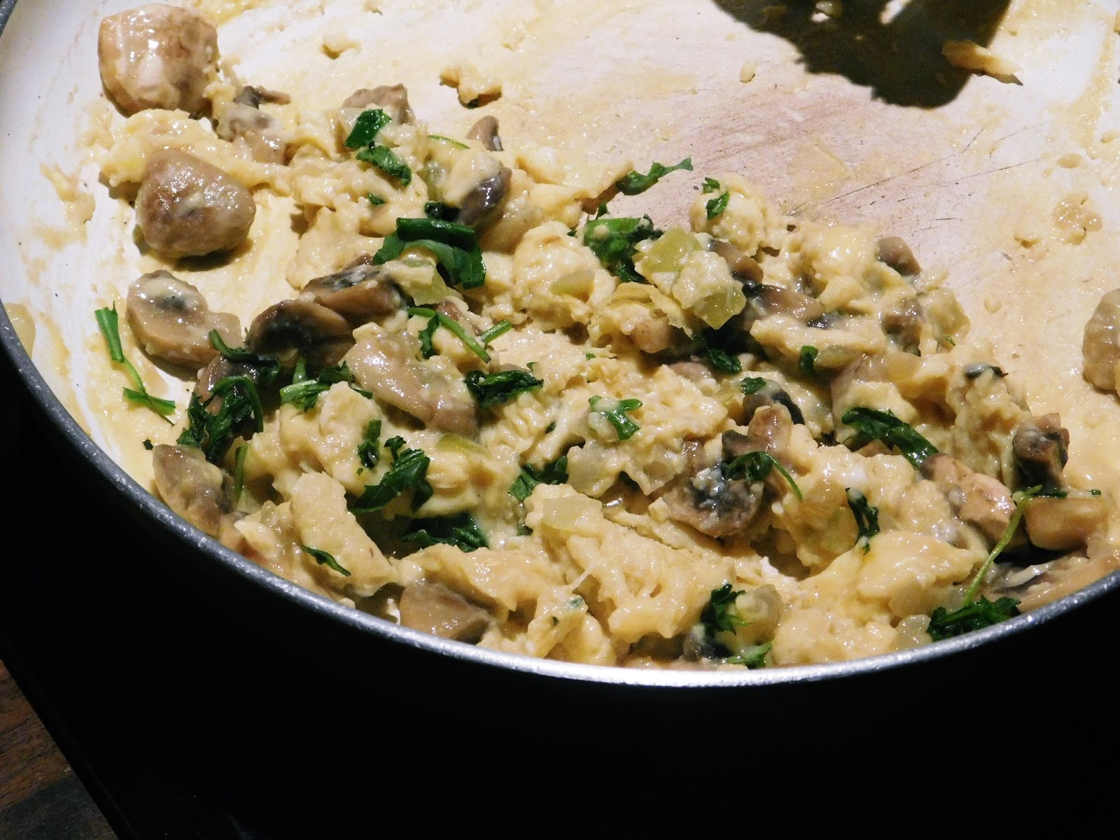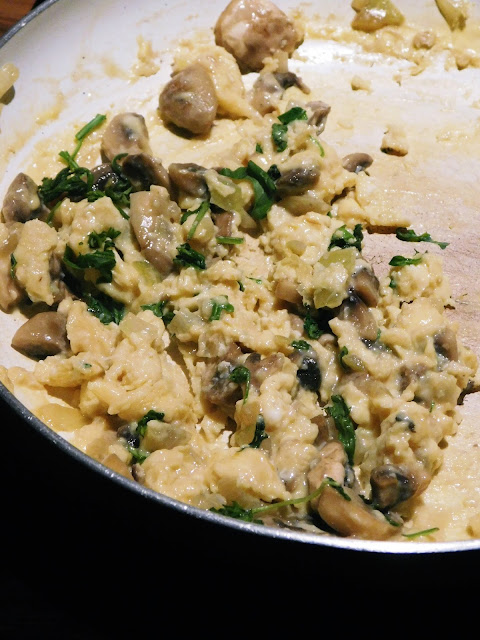 Jajka roztrzepuję ze szczyptą soli. Na patelni roztapiam masło, wrzucam drobno pokrojoną cebulę i pieczarki. Chwilę podsmażam,solę i podlewam niewielką ilością wody, tak by składniki chwilę się podgotowały. Wlewam na patelnię jajeczną masę i wciąż smażę*. Posypuję serem i jeszcze doprawiam. Na sam koniec zdejmuję z ognia i ozdabiam rukolą.