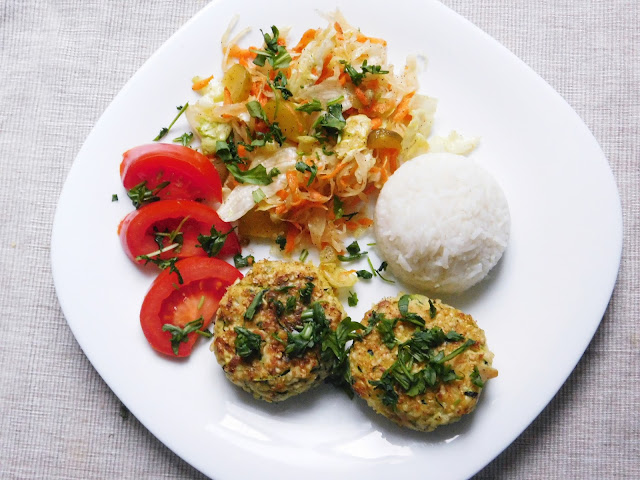 Na obiady zazwyczaj przygotowuję jakieś warzywne kotleciki z dodatkiem mięsa lub ryby. Do tego dużo warzyw (zarówno surowych, jak i gotowanych) i ewentualnie kasza lub ryż. Często też gotuję pożywne zupy krem, które starczą mi na kilka dni.