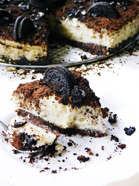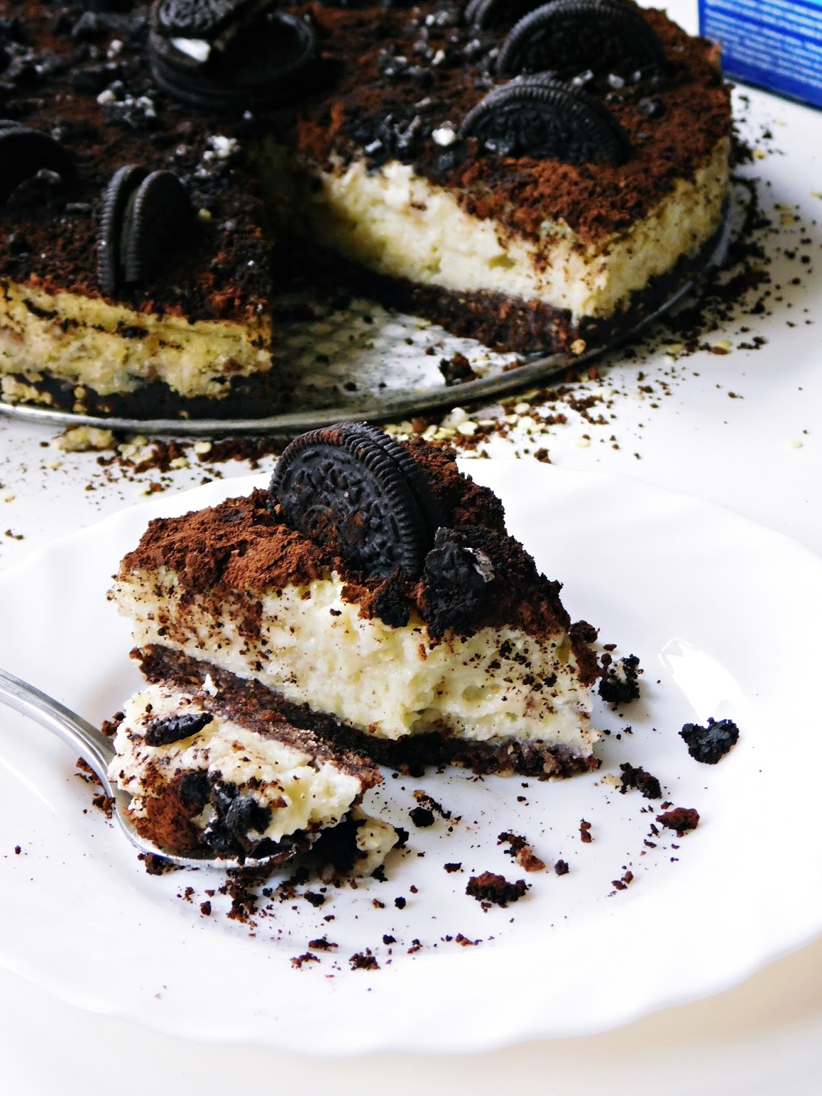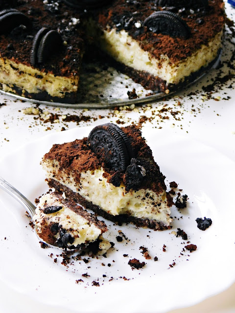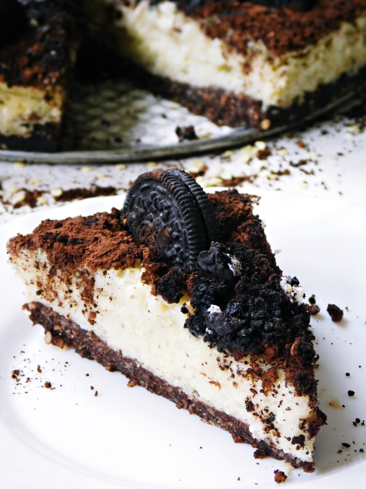 Gotowe ciasto udekorować posypką z kakao i pokruszonych herbatników oraz połówkami ciasteczek Oreo. Schłodzić w lodówce przez co najmniej 2 godziny. Dobrze smakuje podane z owocami sezonowymi - truskawkami lub czereśniami.