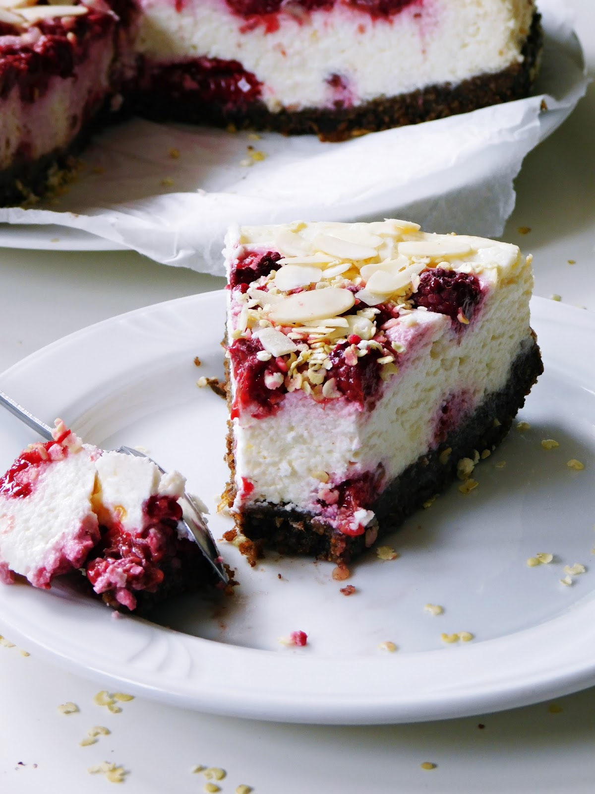 Świeże maliny idealnie dopełniły całość, przełamując słodycz i nadając sernikowi owocowej kwaskowatości w różowym kolorze.