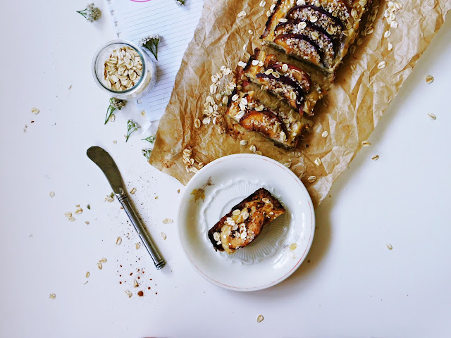 Tak przygotowanym ciastem wykładamy małą, prostokątną formę do pieczenia, którą wcześniej natłuszczamy olejem roślinnym i oproszamy płatkami owsianymi. Spód nakłuwamy widelcem i podpiekamy przez ok. 10 minut w temp. 220 stopni C.