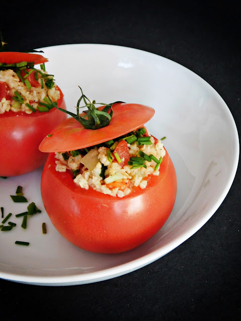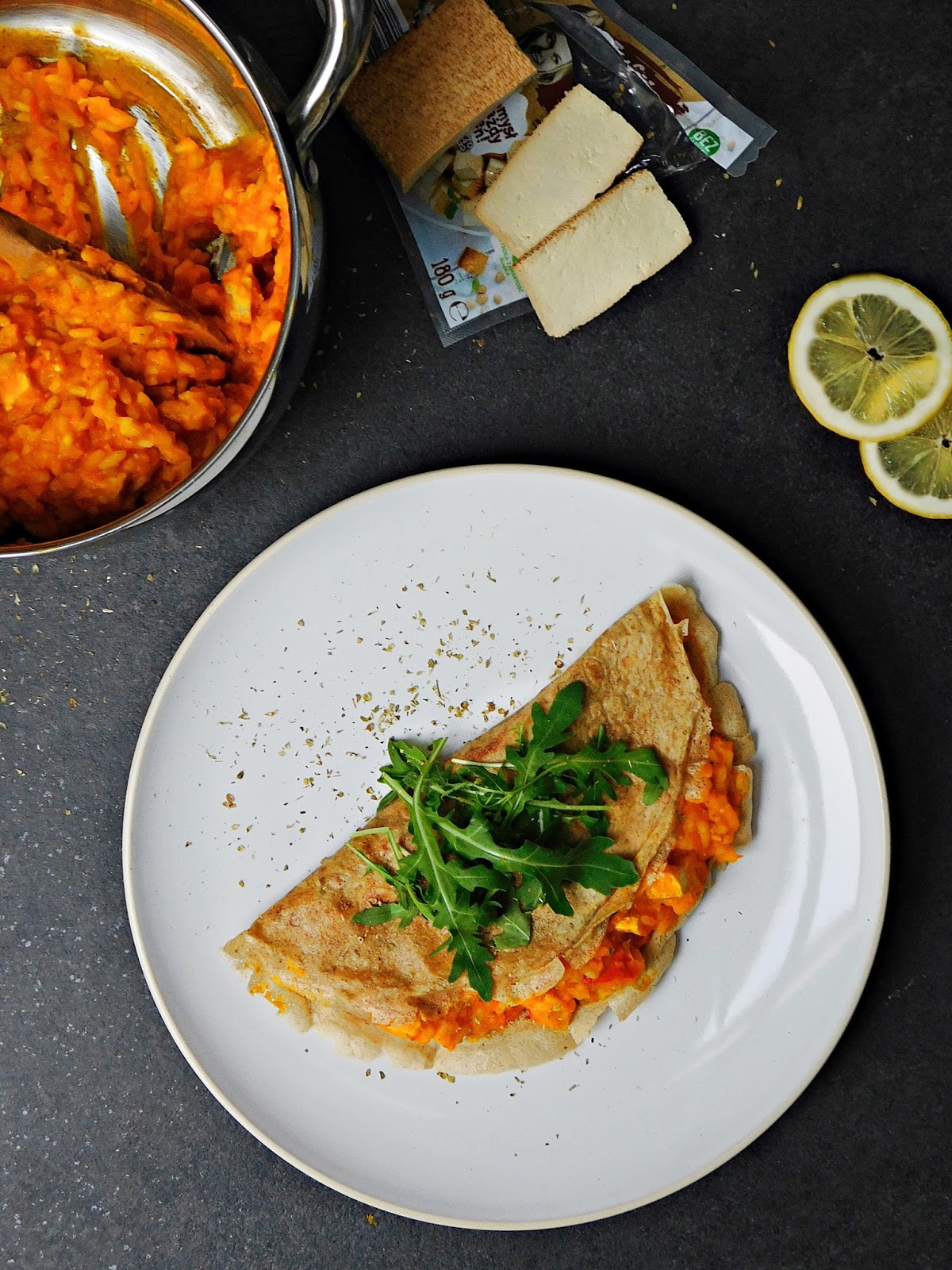 Ja swój farsz zrobiłam z połowy składników - połowy kremu, połowy ugotowanego ryżu i połowy kostki tofu. A jakąś 1/4 z tego wykorzystałam do jednego małego naleśnika wypełnionego po brzegi.