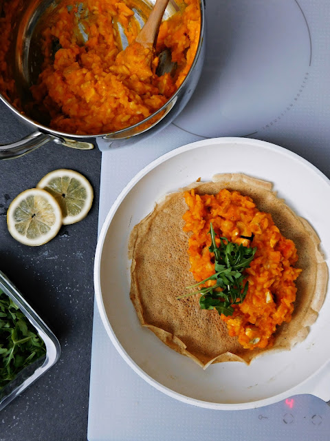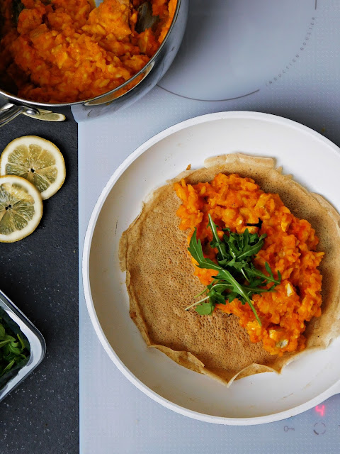 Jesień trwa w najlepsze, a ja przenoszę ją z otoczenia na swój talerz. Powiem Wam, że dyni nie używam zbyt często w swojej kuchni, ale przekonując się do niej teraz, poprzez poznawanie smakowych i zdrowotnych walorów mogę stwierdzić tak: jak dobrze że jesteś, moja kulinarna inspiracjo!. Z dyni robi się kotleciki, zupy, kremy, a na słodko rozmaite babeczki, ciasteczka i serniczki. Jej wszechstronność to ogromny plus, ale i małe utrapienie dla osoby wiecznie niezdecydowanej (jak ja), która nigdy nie wie, co tak właściwie ma ochotę ugotować i zjeść, co będzie wystarczająco dobre by i tym razem stworzyć mały kuchenno-fotograficzny plan. Ale gdzieś, kiedyś, niedawno pojawiła się myśl, by stworzyć naleśniki w nieco innej odsłonie niż połączenie szpinaku i sera które darzę sympatią przeogromną. Samej gramatury i w ogóle przepisu na ciasto naleśnikowe nie podaję dlatego, że mi nigdy z żadnego przepisu nie wychodzą. Zawsze w trakcie smażenia muszę do ciasta a to dodać: jeszcze jedno jajko, a to jeszcze więcej mąki, a to jeszcze odrobinę wody i tłuszczu... wszystko też zależy od patelni, a z tym także bywa różnie. Także wierzę, że w naleśnikowej kwestii radzicie sobie znacznie lepiej niż ja. Od siebie mogę tylko dodać, że w moich, ledwie udanych plackach, w większości znajduje się mąka żytnia, więc weźcie to pod uwagę, bo nadaje sporo smaku!