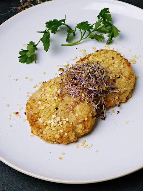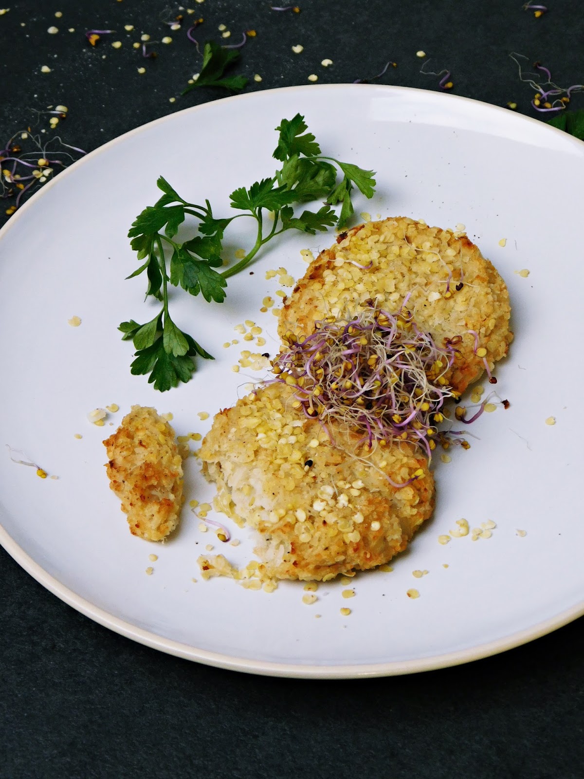 Formę do ciasta delikatnie natłuszczamy olejem roślinnym i posypujemy płatkami jaglanymi (lub ryżowymi). Do formy przelewamy masę sernikową i delikatnie wyrównujemy za pomocą szpatułki.