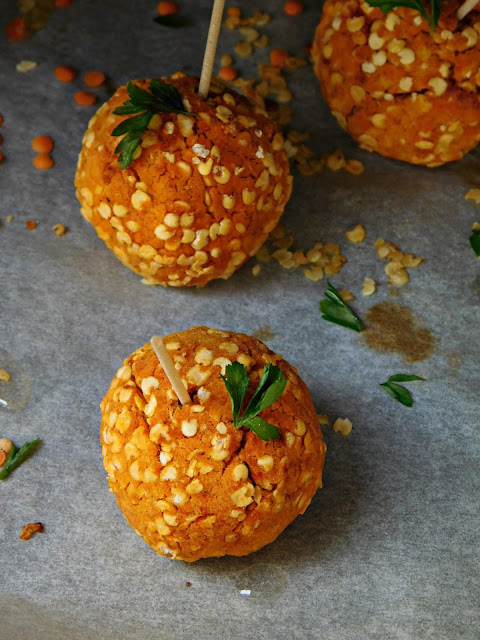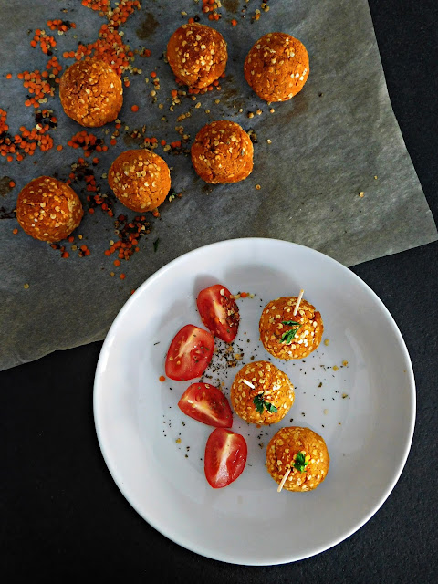 Do tej pory stworzyłam już zupę krem oraz potrawkę z soczewicy, więc teraz czas na... pomidorowe kuleczki. W sam raz jako zagryzka na imprezę, jak i "mięsny" dodatek do obiadu.