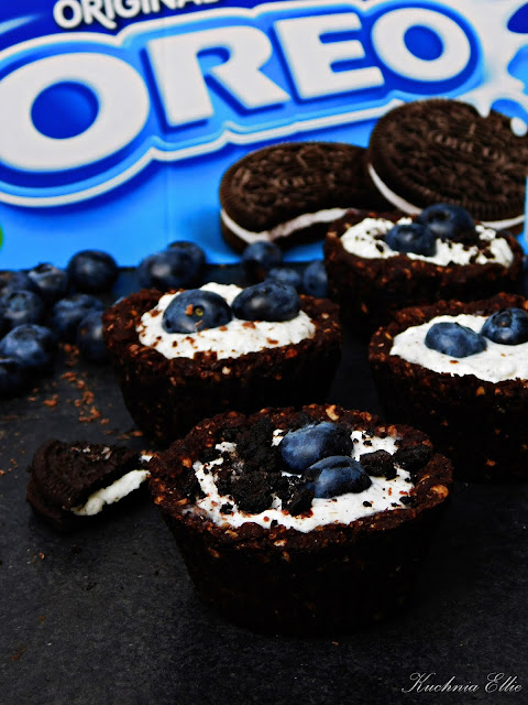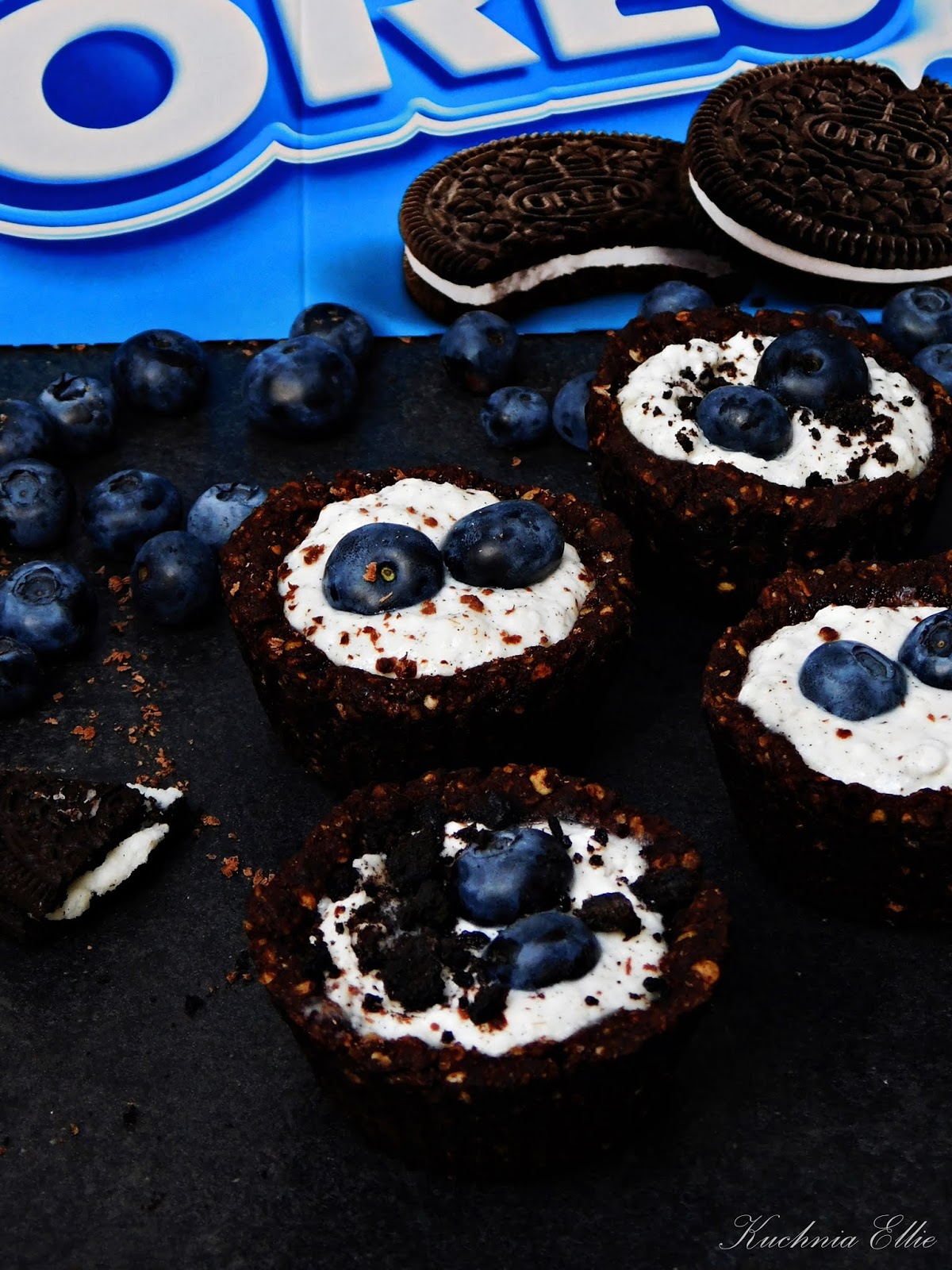 Czekoladowe wnętrze wypełnione waniliowym kremem i borówkami w całkiem dietetycznym wydaniu - jedna babeczka zawiera niecałe 200 kalorii i ponad 8g białka! (tak, razem z wkruszonym ciasteczkiem Oreo!!)